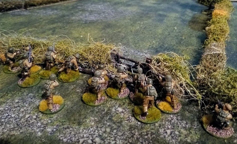 A US squad deploys behind the hedges at the back of the table on over-watch: