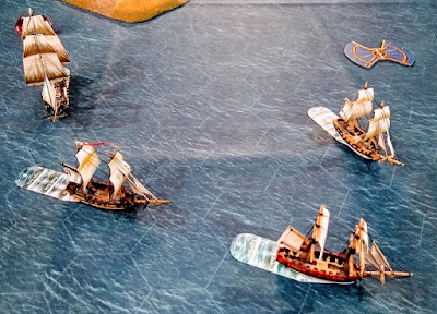 Dave had painted his ships up as British while mine were still rather generic (though destined to be Spanish or French). We used two frigates and three brigs a side and didn't use any nation-specific rules or many of the advanced rules.