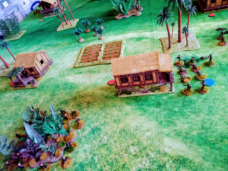 The USMC have a platoon of three sections, two of which are available immediately together with the platoon commander with the third and a supporting M113 arriving later. The VC get an initial two sections with three more coming on later. They need to recruit villagers to make up their numbers before facing the Americans.