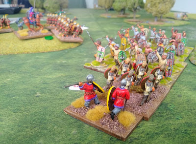 A quite close game that could have gone either way. On reflection it is noticeable that the Romans barely advanced 1/3 of the way on the table, partly as there were enough terrain areas to scout near their deployment zone and partly as it seems suicidal to advance past barbarian deployment points leaving yourself vulnerable to ambushing flank attacks. The ambush seems very powerful for the barbarians, even frontally the Roman auxilia and archers will suffer badly the archers especially as they can't evade.