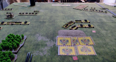 Playing at 300 points with 6mm armies certainly makes it look like a battle, but the extra MO to move units every turn (three MO dice instead of two at 200 points) results in the turns not unreasonably taking longer to play and it being somewhat easier to withdraw damaged brigades before they rout. A smaller table might have helped but I'm not sure how much as it is the MO dice that limit what you can do really, not the table size (the same issues arise in 300 point 15mm games where the table is relatively smaller).