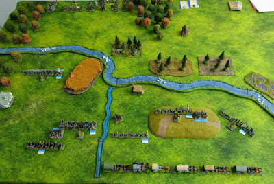 The second game in Dave and I's Longstreet campaign set in 1862 was the 'River Crossing' scenario with Dave's Rebels attacking. Perhaps part of the Seven Day's battles with General Hooker's brigade attempting to hold the Rebels back while the Union evacuates its baggage train.
